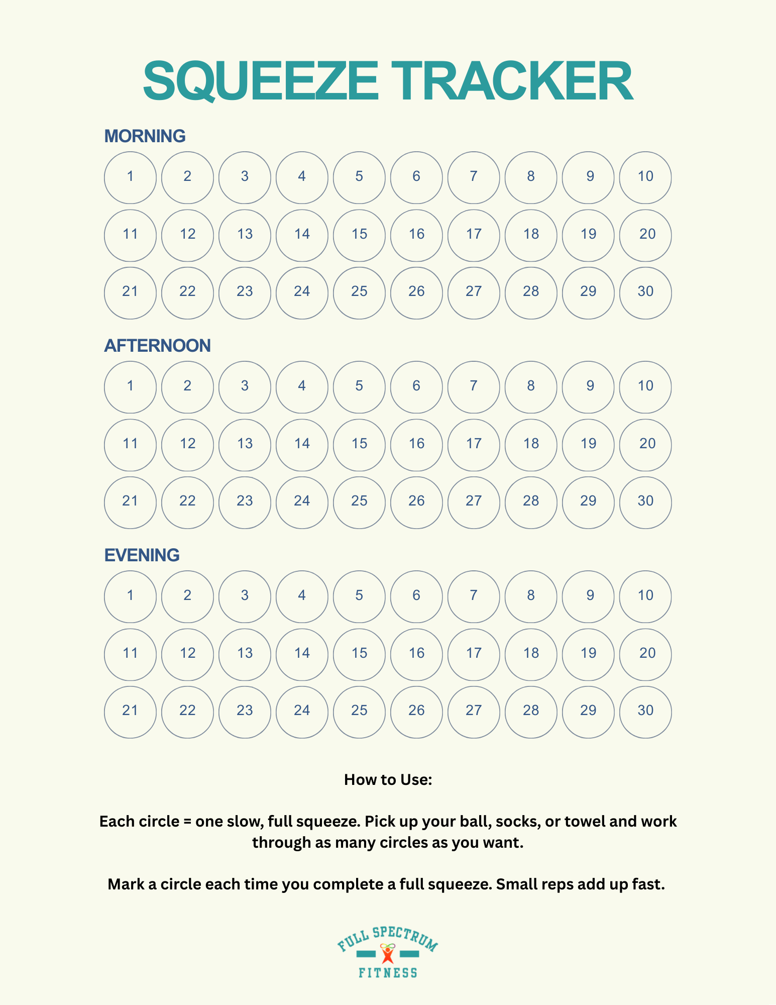 We’ve included a downloadable grip strength tracker you can print or laminate. It gives you a place to practice the routine a few times each week and keep track of how often you do it.